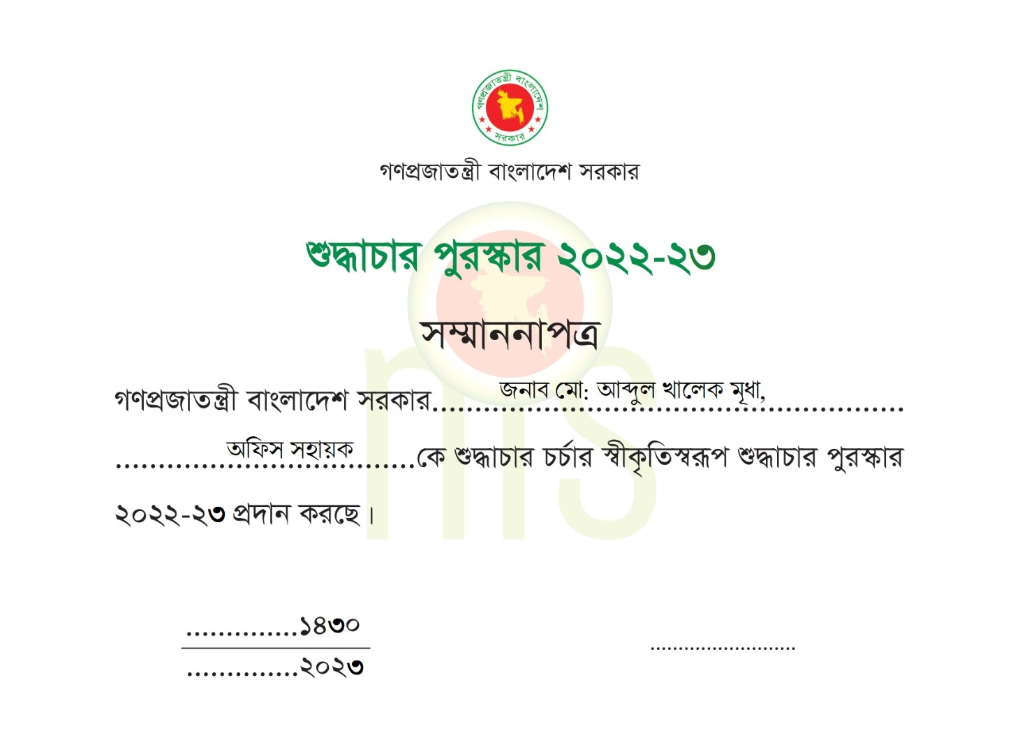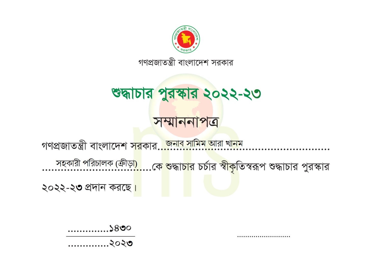 | শুদ্ধাচার পুরস্কার ২০২২-২০২৩ | |